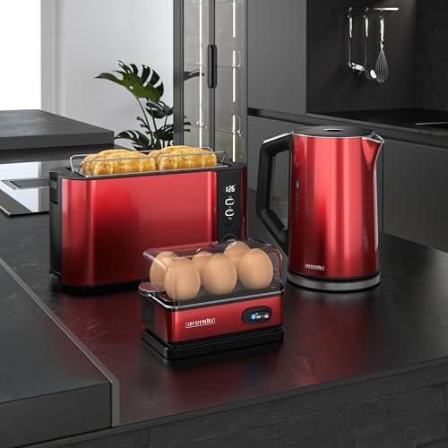 Arendo – Wasserkocher Toaster Eierkocher Set – Edelstahl Wasserkocher mit Temperatureinstellung – Toaster 4 Scheiben Langschlitz – Eierkocher 1-6 Eier – Küchenset in Rot