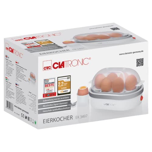 Clatronic® Eierkocher 6 Eier | mit akkustischem Signal (Summer) | inkl. Messbecher und Eipicker | Egg Cooker | Heizschale antihaftbeschichtet | Egg Boiler | EK 3497 weiß