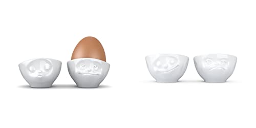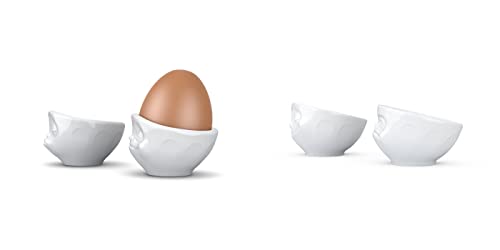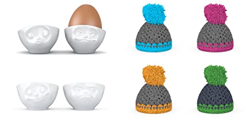 Fiftyeight Eierbecher-Sets Nr. 1 + 3 „Küssend/Verträumt + Erhebend/Hmpff!“ in weiß inkl. 4 farbige Eierbecher-Mützen die Gesamtheit Wolle.