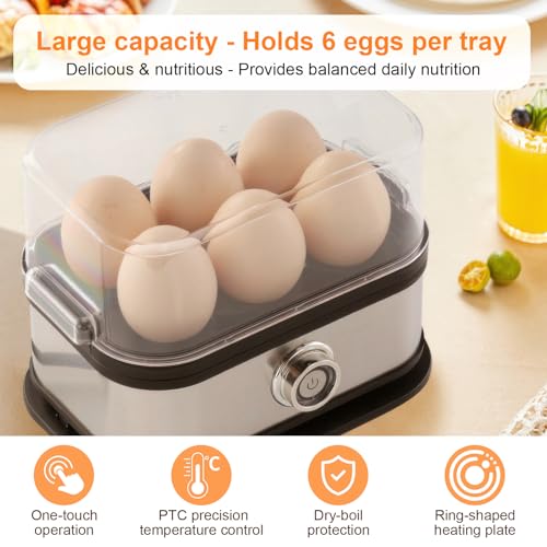 Eierkocher 6 Eier, Eierkocher Edelstahl, 200 W, One-Touch-Start, Warmhaltefunktion, BPA-frei, leicht zu reinigen mit PTC-Temperaturregelung, Anti-Trockenbrennen, Messbecher inklusive