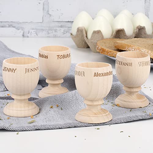 Graviert werden die Holzeierbecher, die in Form eines Kelches gestaltet sind, weiterhin mit dem jeweiligen Namen: auf jede der vier Becher kommt ein unterschiedlicher. Somit eignet sich das Set als Geschenk für die ganze Familie!