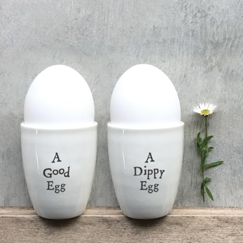 Traditionelles lustiges Set mit 2 Porzellan-Eierbechern – Weiß mit schwarzem Good Egg/Dippy-Egg-Schriftzug – 5,5 cm